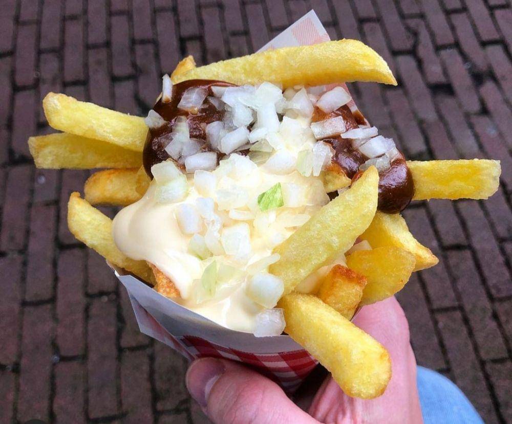 Patatje Oorlog adalah hidangan khas Belanda yang terkenal dengan kombinasi kentang goreng, mayones, saus cokelat, dan bawang bombay, menawarkan cita rasa gurih dan unik.