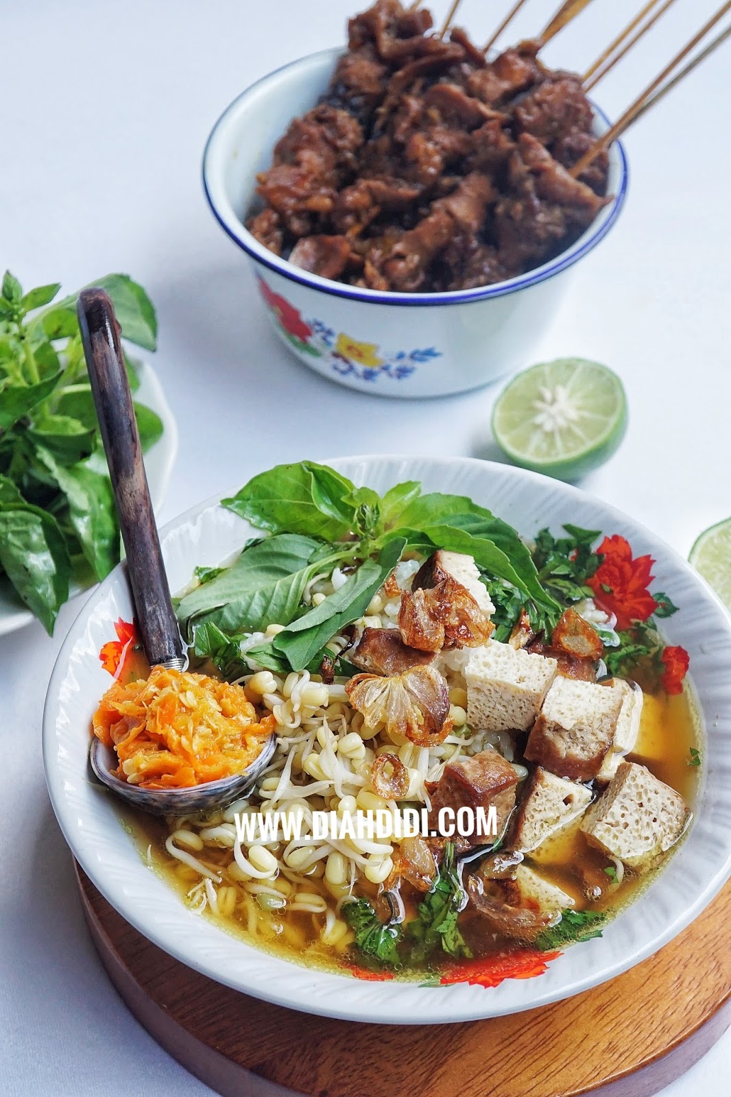 Selain daun kemangi, bahan lain yang menjadi pelengkap adalah bihun atau soun, potongan telur rebus, dan irisan daun bawang serta seledri yang menambah aroma segar. Untuk kuahnya sendiri, rempah-rempah tradisional seperti serai, lengkuas, jahe, dan kunyit digunakan sebagai bahan dasar yang memberi warna dan aroma khas. Bumbu halus seperti bawang merah, bawang putih, kemiri, dan cabai juga menjadi bagian penting yang dihaluskan dan dimasak bersamaan dengan rempah-rempah lainnya.